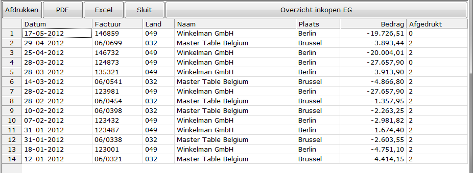 Het overzicht van alle Inkopen. U kunt dit afdrukken, een PDF bestand van maken of naar Excel exporteren.